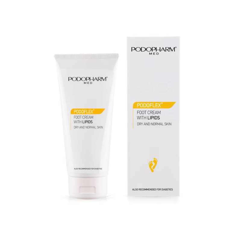 PODOPHARM PODOFLEX fotkrem skaper en unik kombinasjon av naturlige fettstoffer fra sheasmør, vegansk lanolin Lipex L'sens og appelsinskallvoks, samt hamp- og soyaolje. Produktet inneholder ekstrakter av ringblomst, salvie, vannmynte og vitamin E. Allantoin lindrer irritasjon og fremmer fornyelse av skadet hud. Naturlig mandarin- og mynteolje gir kremen en behagelig, eksotisk duft. Kremen absorberes perfekt og etterlater føttene myke og glatte.